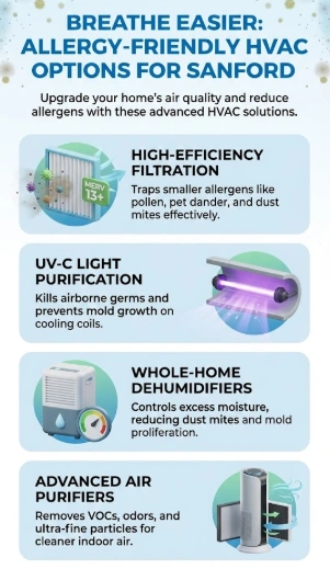 Sanford's year-round humidity and pollen cycles make indoor air quality a constant battle for allergy sufferers. Your HVAC replacement is the single best opportunity to fix this at the source.